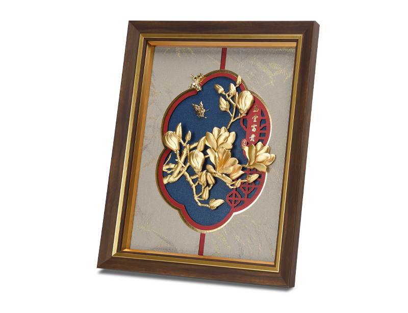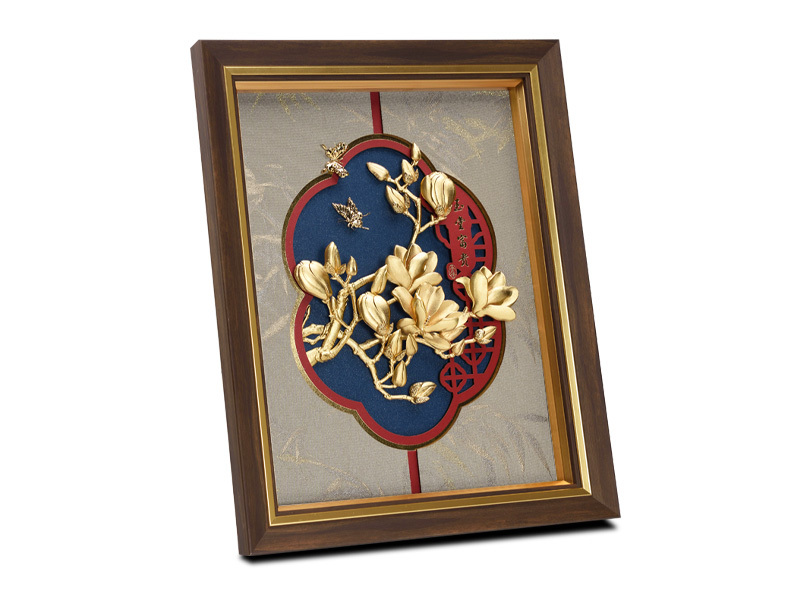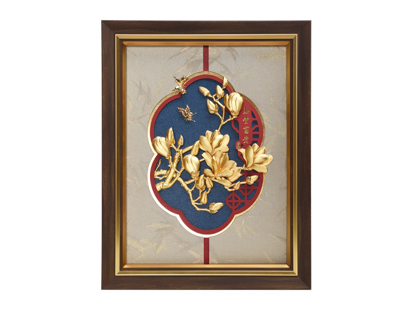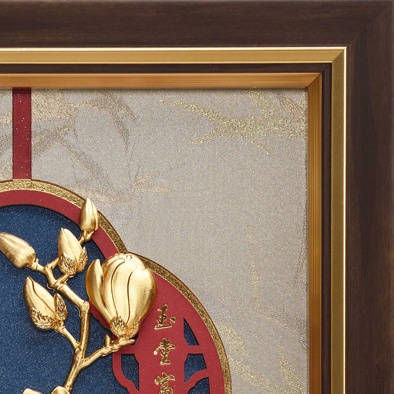 以 典雅端庄 为设计理念,结合立体金箔工艺与独特装裱造型,营造出富含文化韵味的艺术格调。画框比例为 26x33cm,体量适中,适合各类空间陈设。